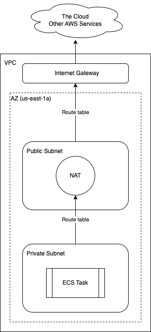 So you have a container in a private subnet, and a NAT gateway in a public subnet in the same availability zone. The container can talk to the NAT gateway via the private subnet’s route table, and the NAT gateway can talk to the internet gateway via the public subnet’s route table, which in turn connects to the internet. And all of this is inside the VPC.